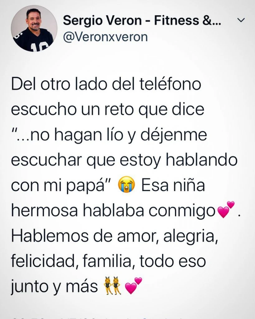 Quiero compartir con la gente un posteo que hiciste", dijo el Pollo Álvarez a Verón: “Del otro lado del teléfono escucho que dice 'no hagan lío, que estoy hablando con mi papá'. Esa niña hablaba conmigo. Hablemos de amor, alegría, felicidad, familia. Todo eso junto y más", leyó la locutora del programa.