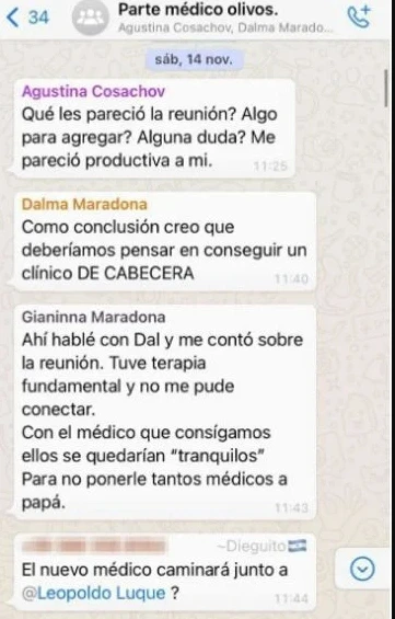 Quien puso al aire el chat de la familia fue Rodrigo Lussich en Intrusos. Lo primero que llamó la atención fue el nombre del grupo: "Parte médico Olivos". En la clínica con ese nombre, Maradona fue operado de un hematoma subdural en una cirugía que también arrojó sorpresas posteriores: se supo que no la llevó adelante el doctor Leopoldo Luque, médico y amigo de Maradona, sino un equipo de "4 cracks de la neurocirugía" convocados especialmente para la ocasión.