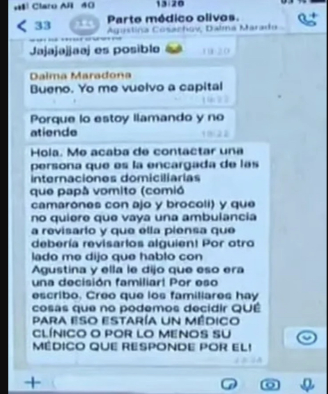 Quien puso al aire el chat de la familia fue Rodrigo Lussich en Intrusos. Lo primero que llamó la atención fue el nombre del grupo: "Parte médico Olivos". En la clínica con ese nombre, Maradona fue operado de un hematoma subdural en una cirugía que también arrojó sorpresas posteriores: se supo que no la llevó adelante el doctor Leopoldo Luque, médico y amigo de Maradona, sino un equipo de "4 cracks de la neurocirugía" convocados especialmente para la ocasión.