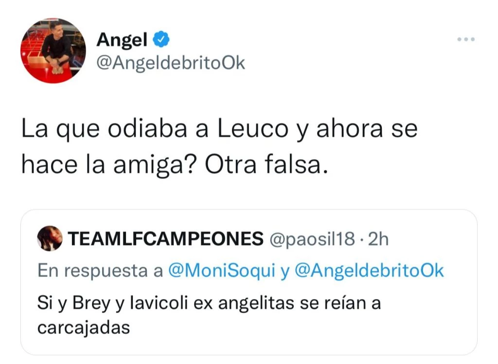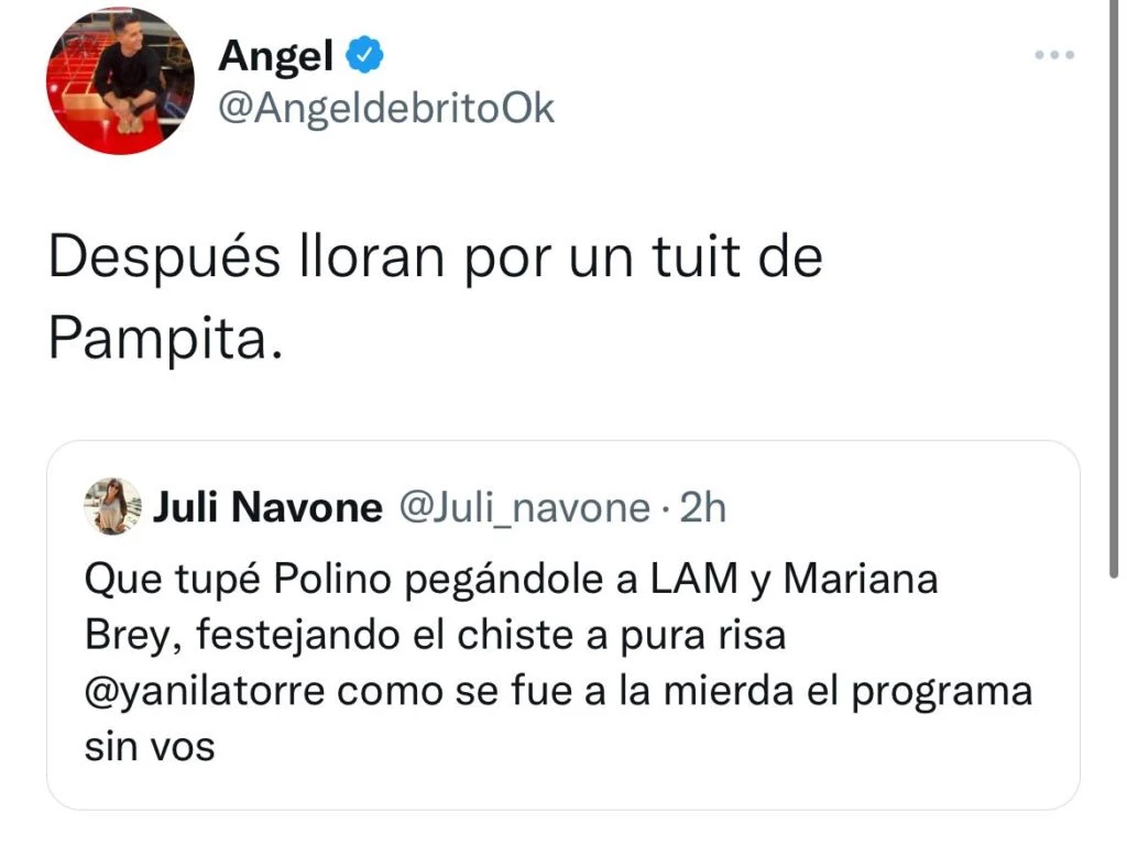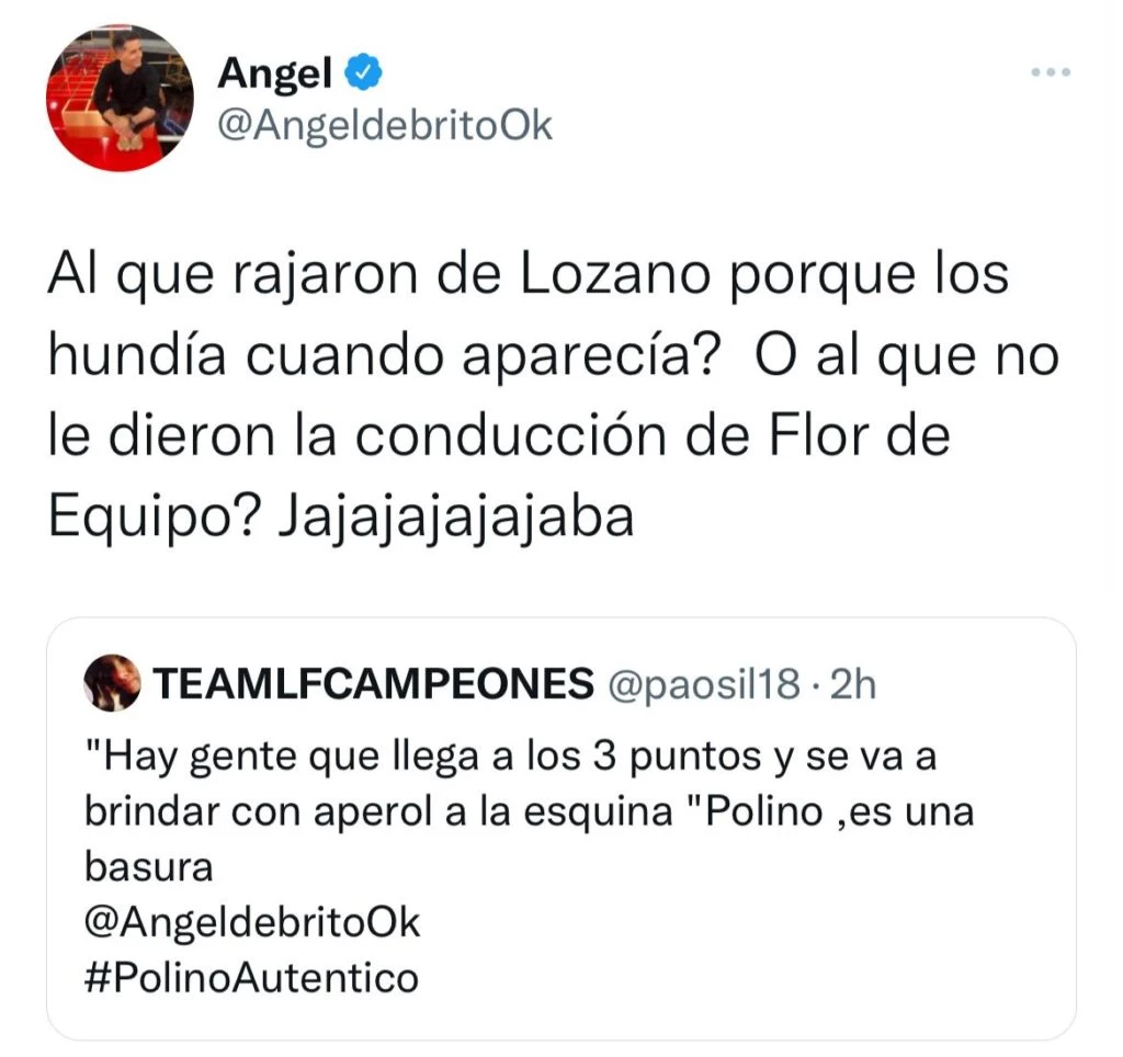 Sin embargo hoy, Marcelo Polino lanzó una broma al aire que fue festejada a las carcajadas por Karina Iavícoli y Mariana Brey que parecía ir para LAM: "Hay gente que llega a los 3 puntos y se va a brindar con Aperol a la esquina". Enfurecido, Ángel de Brito le respondió por Twitter: "Al que rajaron de Lozano porque los hundía cuando aparecía? O al que no le dieron la conducción de Flor de Equipo?".