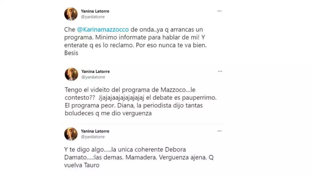 Fiel a sus principios, Yanina Latorre no se quedó callada y apuntó desde su cuenta de twitter directamente contra la conductora y sus panelistas. “Tengo el videito del programa de Mazzocco ¿Le contesto? El debate es paupérrimo. El programa peor. Diana Deglauy, la periodista, dijo tantas boludeces que me dio vergüenza”.