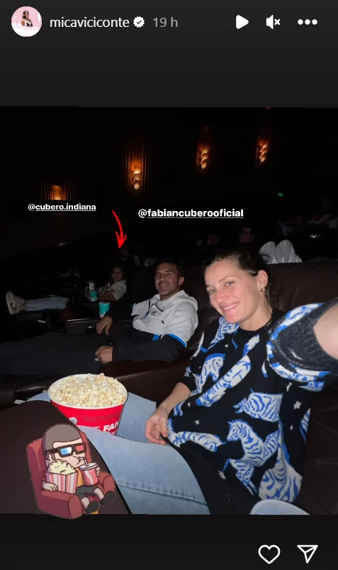 Esta vez, Mica compartió en sus historias de Instagram una foto donde se la ve dentro de una sala de cine junto a Cubero y, más lejos, Indiana. Por si quedaban dudas, la marplatense aplicó una flecha roja y la etiquetó.