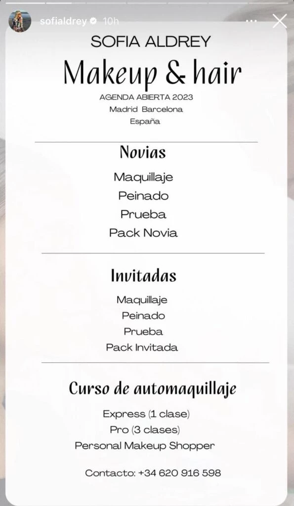 “Después de unas lindísimas vacaciones ya estoy agendando makeups, fotos y cursos en Madrid y Barcelona. Les dejo toda la info y cualquier cosa me consultan”, escribió Sofía entre sus historias antes de publicar que entre sus servicios incluye también peinados tanto de novias como invitadas y talleres de automaquillaje.