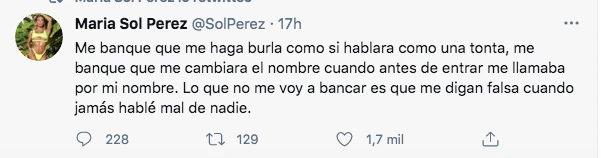 En Twitter, donde la siguen casi 500 mil personas, Sol escribió los motivos por los cuales se enfrenta con La Chepi. "Me banqué que me haga burla como si hablara como una tonta, me banqué que me cambiara el nombre cuando antes de entrar me llamaba por mi nombre" recordó la rubia.