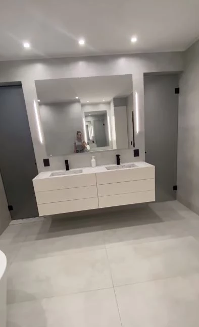 Porcelanato gris, muebles blancos y mucho estilo, así es el baño mega moderno de Fernández, que está feliz con lo linda que está quedando su flamante vivienda.
