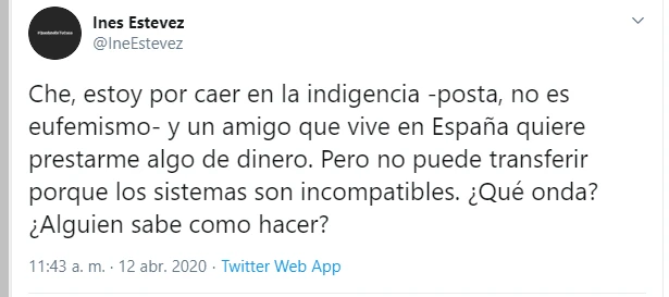 "Che, estoy por caer en la indigencia -posta, no es eufemismo- y un amigo que vive en España quiere prestarme algo de dinero. Pero no puede transferir porque los sistemas son incompatibles. ¿Qué onda? ¿Alguien sabe como hacer?", escribió la actriz en su cuenta de Twitter.