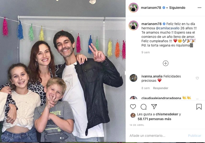 "Feliz feliz en tu día hermosa Camila Caballo 26 años! Te amamos mucho. Espero sea el comiendo de un año lleno de amor..", escribió el actor junto a una foto de la modelo junto a Olivia y Milo, hijos de Mariano fruto de su relación con Juliana Giambroni.