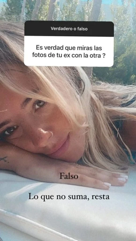 "¿Es verdad que mirás fotos de tu ex con la otra?", disparó un usuario, directo al grano, literalmente. ¿Y qué contestó Nati? "Falso, lo que no suma, resta", señaló, cortita y al pie, y sumó una foto donde se la ve con gesto de paz, muy relajada tomando sol en la playa de Villa Gesell, donde está instalada desde hace unas semanas.