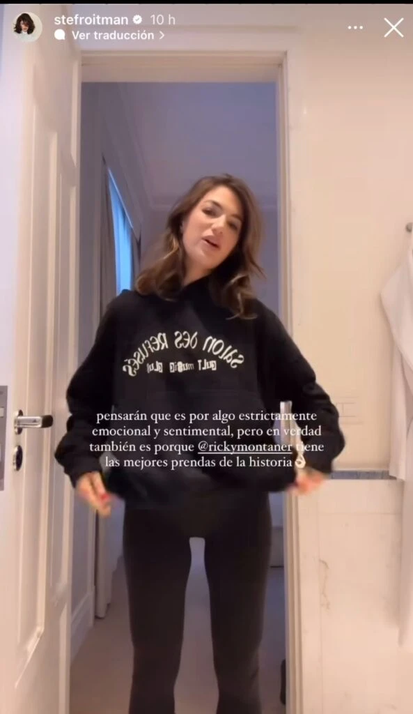 Posando para la lente de su celular, Stefi grabó un video para sus historias de instagram en la que, luciendo un buzo negro con capucha, lanzó: “Sabían que, por lo general, a todos viajes me llevo uno de Ricky, de mi esposo. El elegido para este viaje fue este que me encanta”.
