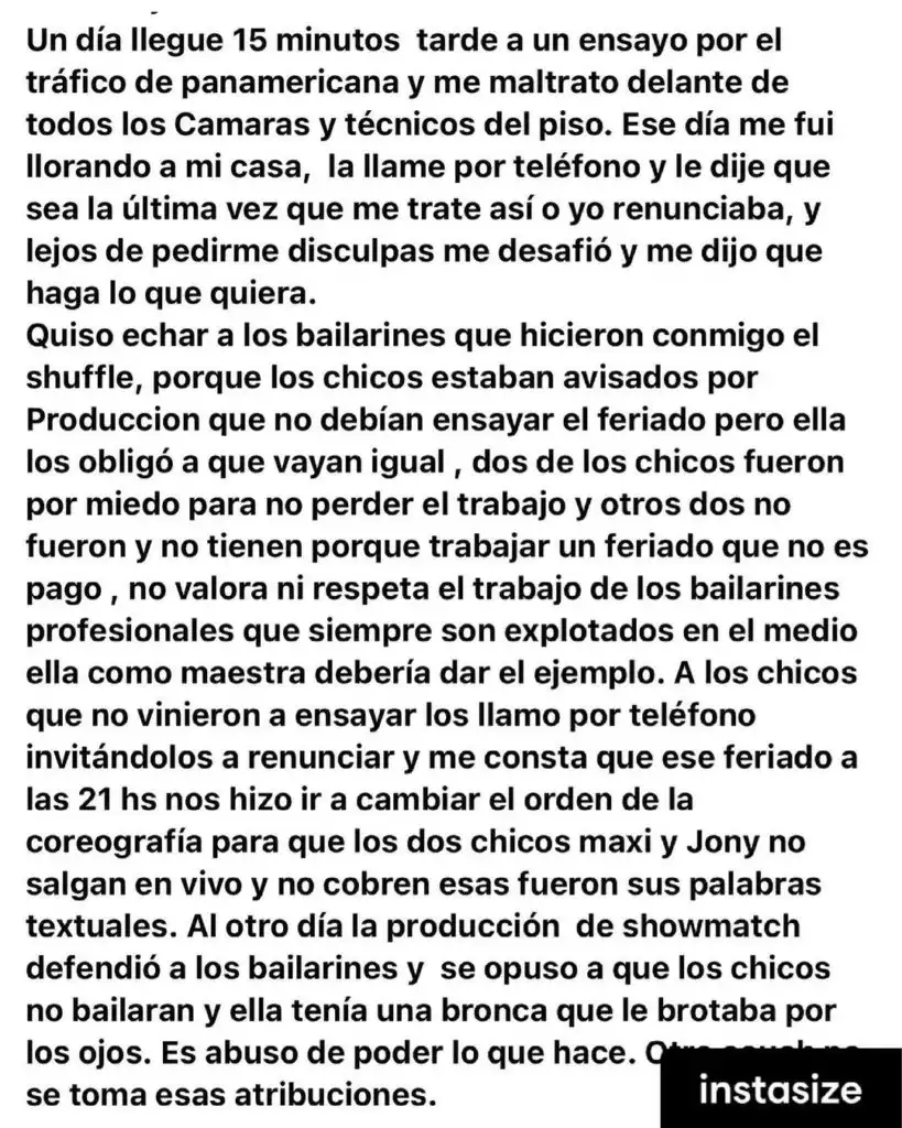 "Esta persona no es víctima de nada. Es una mujer con mucha influencia en canal 13 por su pareja. Es muy soberbia, autoritaria y cree que todos les tenemos que chupar las medias por el poder que ella tiene", agregó. "Si no ensayábamos al horario que ella quería se enojaba", explicó sobre la denuncia de la coach que llegaba siempre tarde a los ensayos.