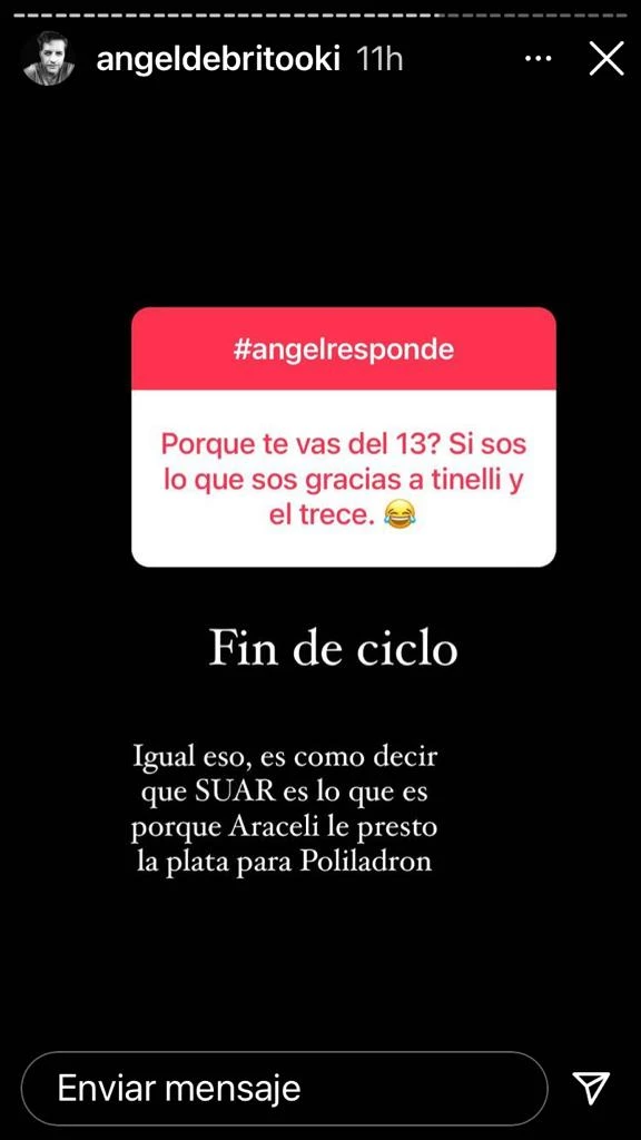 El periodista suele utilizar las stories, de Instagram, e invita a sus followers a que le hagan preguntas a través del sticker de consignas y el hashtag "#angelresponde". Ayer, uno de sus seguidores le escribió: "Porque te vas del 13? Si sos lo que sos gracias a tinelli y el trece."; además, la interrogación iba acompañada por el emoji de una cara llorando de la risa.