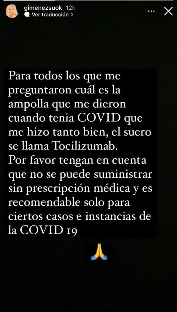 “Para todos los que me preguntaron cual es la ampolla que me dieron cuando tenía COVID-19 que me hizo tanto bien, el suero se llama Tocilizumab. Por favor, tengan en cuenta que no se puede suministrar sin prescripción médica y es recomendable solo para ciertos casos e instancias”, escribió la Diva en sus historias.