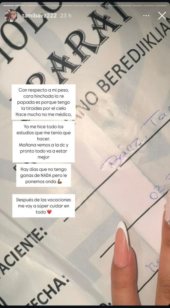 Pero fue segundos después de esa publicación que Báez compartió en la misma red social lo que parecía ser una orden médica con sus datos a lo que explicó: “Con respecto a mi peso, cara hinchada, la re papada, es porque tengo la tiroides por el cielo”.