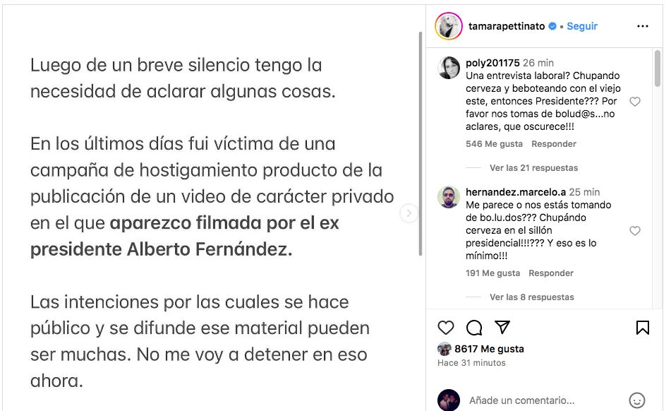 Más allá de todas las dudas que se generaron sobre su lazo con el político y la fecha del video, Tamara optó por remarcar su padecimiento y contó: “Las intenciones por las cuales se hace público y se difunde ese material pueden ser muchas. No me voy a detener en eso ahora. Sí tengo que decir que desde que se publicó estoy siendo blanco de innumerables acosos y amenazas referidas a mi vida privada plagadas de mentiras e información falsa”.