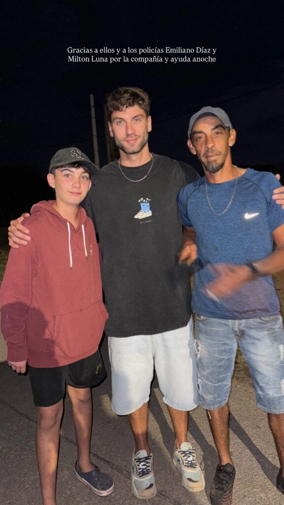 Santiago confirmó que no quedó herido tras el durísimo impacto: “Pero yo estoy bien. En un rato me van a llevar para hacer un chequeo general, más que nada por prevención, porque tuve un golpe en la rodilla, en las costillas y quieren quedarse tranquilos”. A la vez, compartió una foto con las personas que lo acompañaron durante el siniestro: “Gracias a ellos y a los policías Emiliano Díaz y Milton Luna por la compañía y ayuda anoche”.
