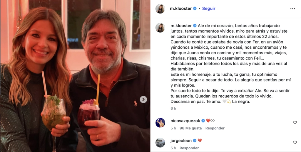 “Ale de mi corazón, tantos años trabajando juntos, tantos momentos vividos…”, comenzó escribiendo, en un posteo que rápidamente se llenó de mensajes de apoyo y acompañamiento.