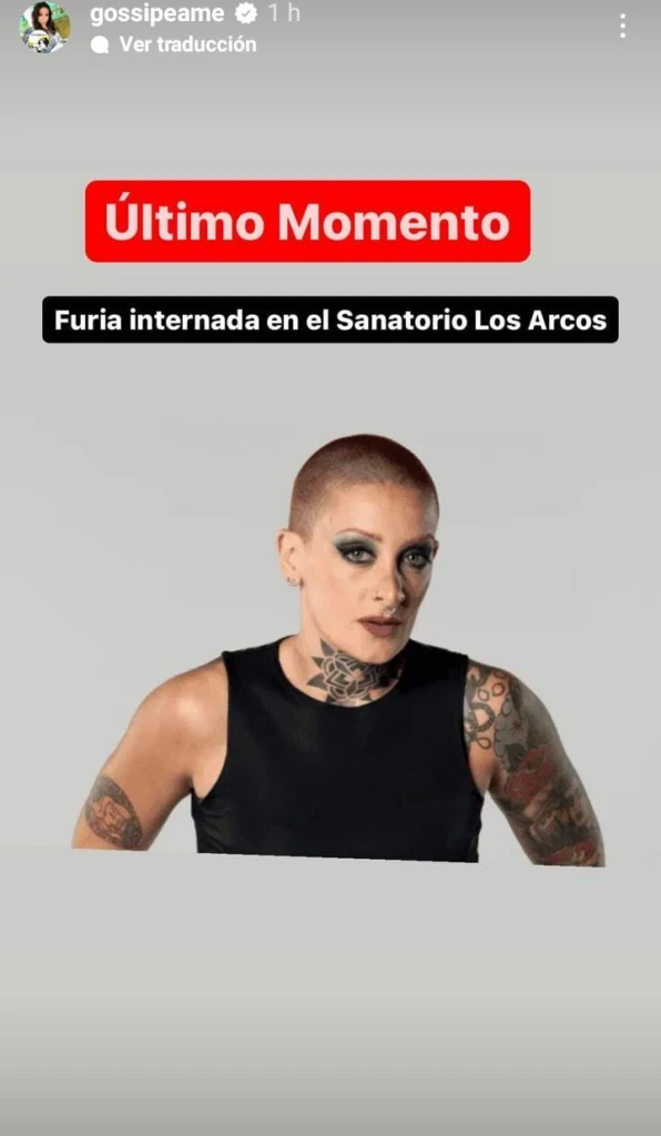 “Último momento. Furia fue internada en el Sanatorio Los Arcos”, expresó Pochi, de la cuenta Gossipame, a través de su Instagram. De todas formas, su ingreso a la clínica puede ser para profundizar en los estudios que necesitan realizarle.