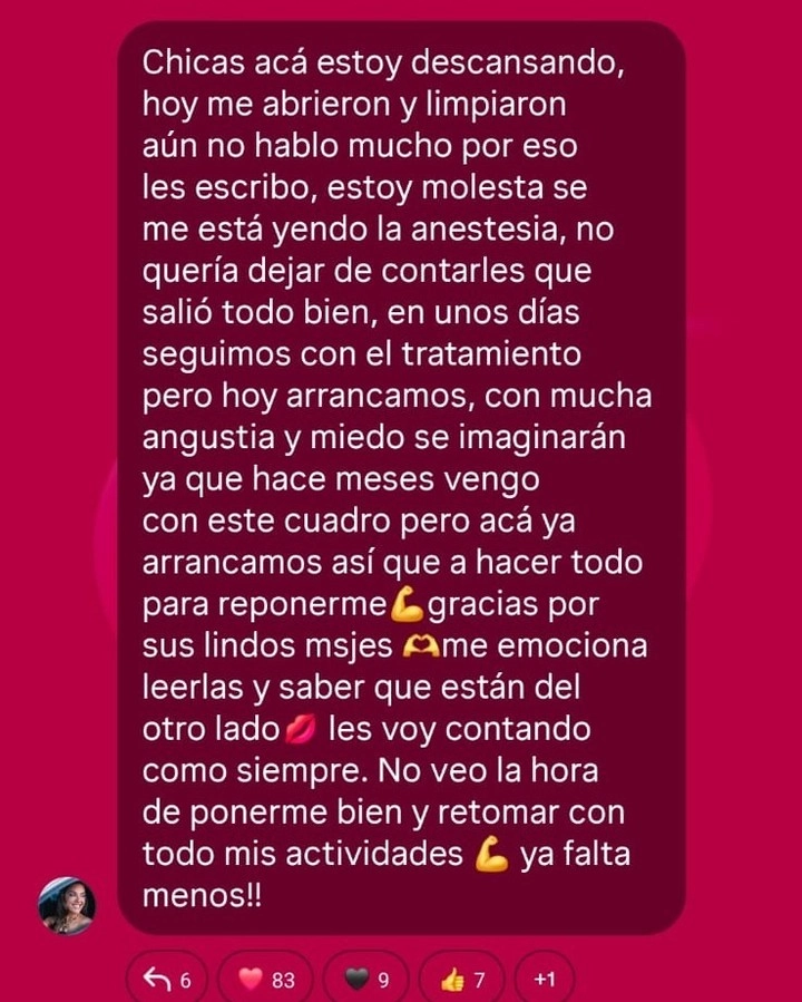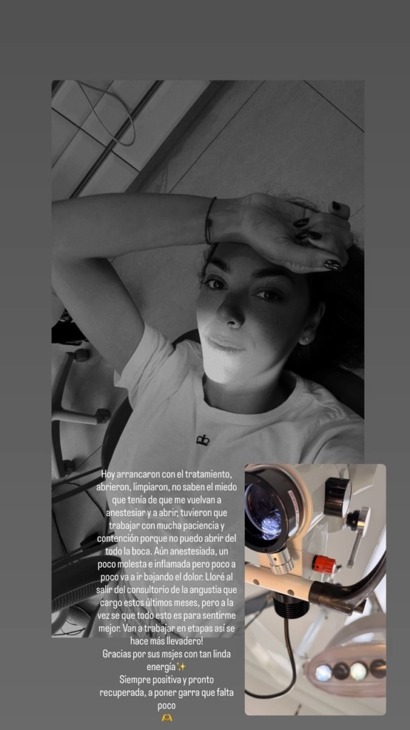 Desde el consultorio, y aún con signos visibles de cansancio, compartió una imagen que reflejó el momento que está atravesando. Pero lo más fuerte llegó con su relato: “No saben el miedo que tenía de que me vuelvan a anestesiar y a abrir”, confesó, dejando en evidencia el nivel de angustia que le generó retomar el tratamiento.
