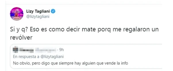 Respaldada en la cursada que viene haciendo desde comienzo de año con el sueño de recibirse de abogada, Lizy publicó en su cuenta de Twitter un contundente mensaje dirigido a Magaldi. “Es un delito dar a conocer el nombre de los pacientes sin el consentimiento explícito de la persona afectada... ¿o esto cambió?”.