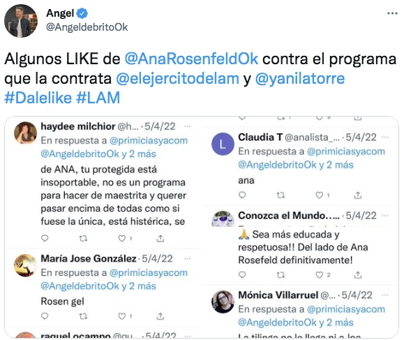 "Algunos LIKE de @AnaRosenfeldOk contra el programa que la contrata @elejercitodelam y @yanilatorre #Dalelike #LAM", presentó Angel, en su cuenta de Twitter. "Ana no está a tu nivel el programa"; "Estoy con Rosenfeld, Yanina muy insorpotable y se le ve mucho que quiere ser la protagonista", fueron algunos de los mensajes que compartió el periodista.