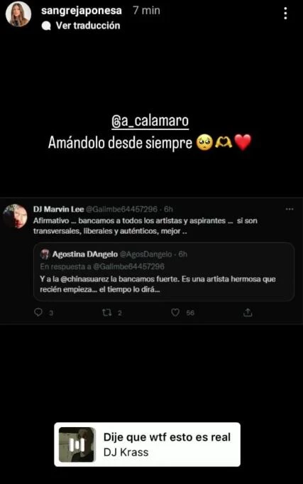 "Afirmativo, bancamos a todos los artistas y aspirantes, si son transversales, liberales y auténticos, mejor", sentenció El Salmón. Feliz por contar con el aguante y el aval del músico, Sangre Japonesa compartió el tweet en sus historias con un cariñoso mensaje.