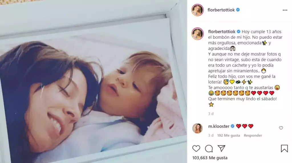 "Hoy cumple 13 años el bombón de mi hijo. No puedo estar más orgullosa, emocionada y agradecida. Y aunque no me deje mostrar fotos que no sean vintage, subo esta de cuando era todo un cachete y yo lo podía apretujar sin miramientos”, arrancó la actriz su posteo.