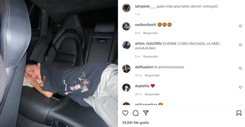 “¿Quién más ama tanto dormir como yo?”, preguntó la artista a sus 117 millones de seguidores que le festejan cualquier cosa que publique, con una foto donde se la ve entregada en los brazos de Morfeo, en el asiento de atrás de un auto. ¿Seguirá compartiendo revelaciones?