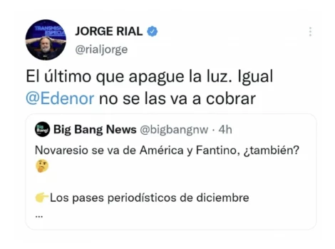En las últimas horas, Jorge aterrizó a Twitter, un campo en el que se mueve con mucha libertad para activar sus opiniones picantes. Y construyó una filosa ironía contra América, su casa durante décadas, lo que encendió una polémica.