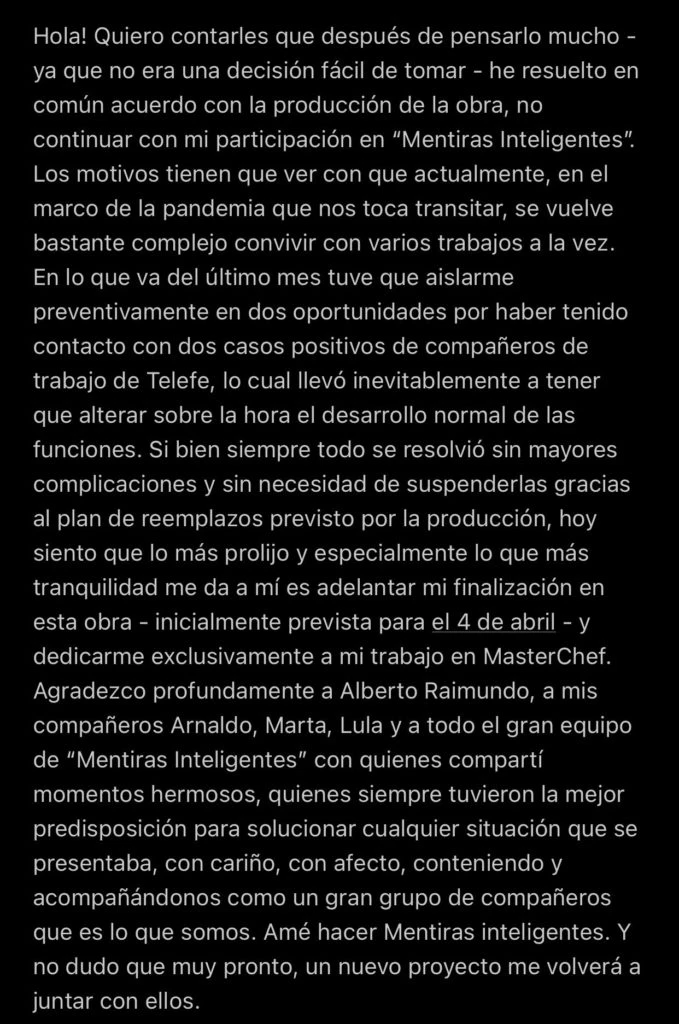 “¡Hola! Quiero contarles que después de pensarlo mucho, ya que no era una decisión fácil de tomar, he resuelto en común acuerdo con la producción de la obra, no continuar con mi participación en Mentiras inteligentes”, arrancó el hijo de Carmen Barbieri.