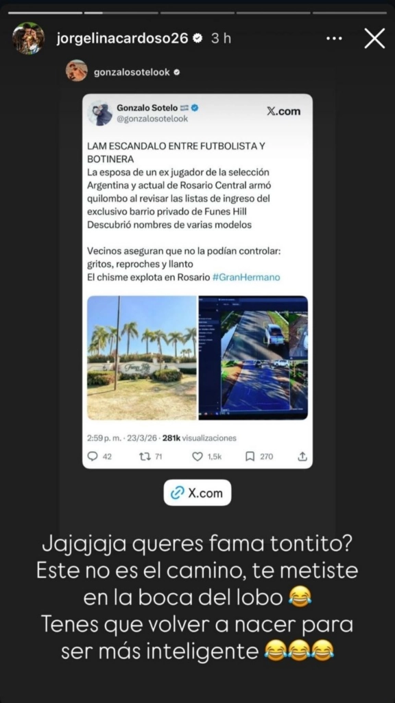En una seguidilla de publicaciones, Cardoso compartió capturas del perfil del joven y lo acusó de buscar notoriedad a partir de versiones falsas. “Se metió con la familia equivocada”, lanzó, dejando en claro que no estaba dispuesta a dejar pasar el tema.
