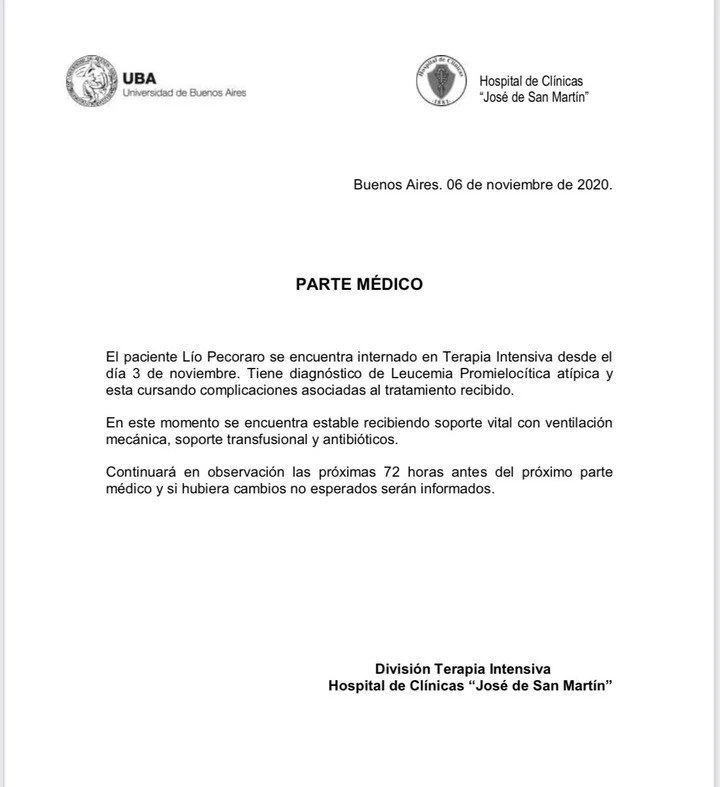 Por otra parte, los doctores dejaron constancia de que Pecoraro estará bajo observación las próximas 72 horas y en aquel entonces enviarán otro parte médico, a excepción de algún cambio rotundo en su estado de salud: “Si hubiera cambios no esperados serán informados”.