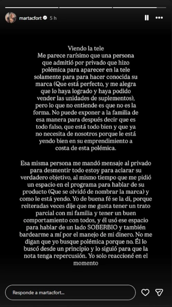 Pero del otro lado, la respuesta no tardó en llegar. Marta Fort, fiel a su estilo frontal, salió al cruce en un streaming donde no dudó en ironizar sobre su primo y cuestionar sus verdaderas intenciones. Las declaraciones subieron rápidamente de tono y dejaron en evidencia una ruptura total en el vínculo.