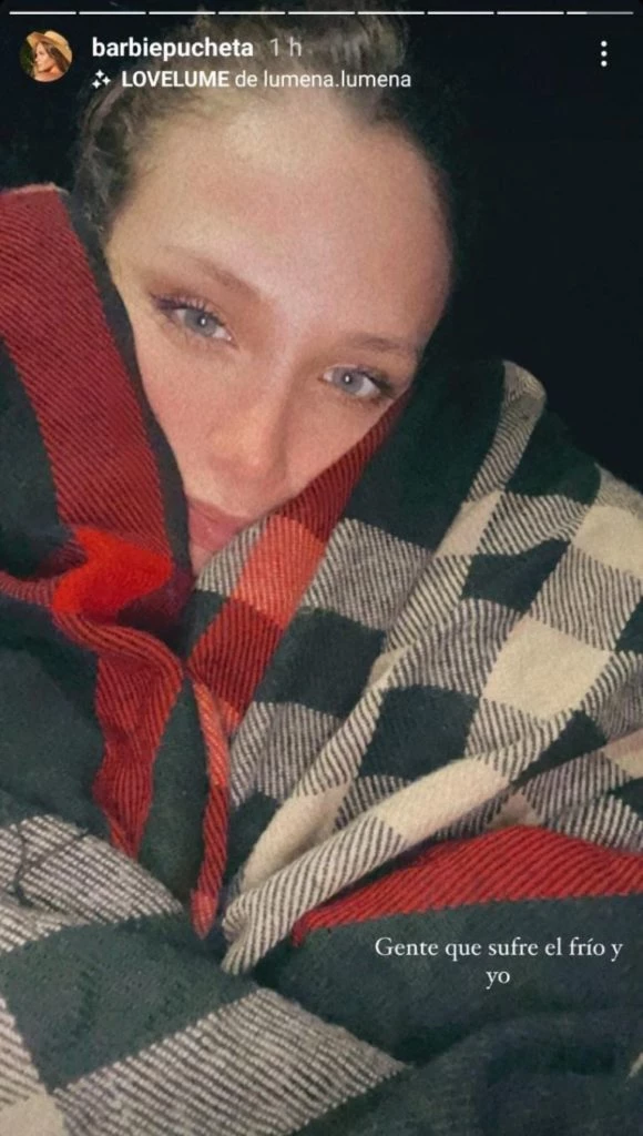 En cuanto a lo que está sufriendo, Barbie subió una foto a su historia de Instagram en donde se la puede ver bastante abrigada y con una manta por encima, por lo que adjuntó ante tal evidencia la siguiente frase: "Gente que sufre el frío y yo".