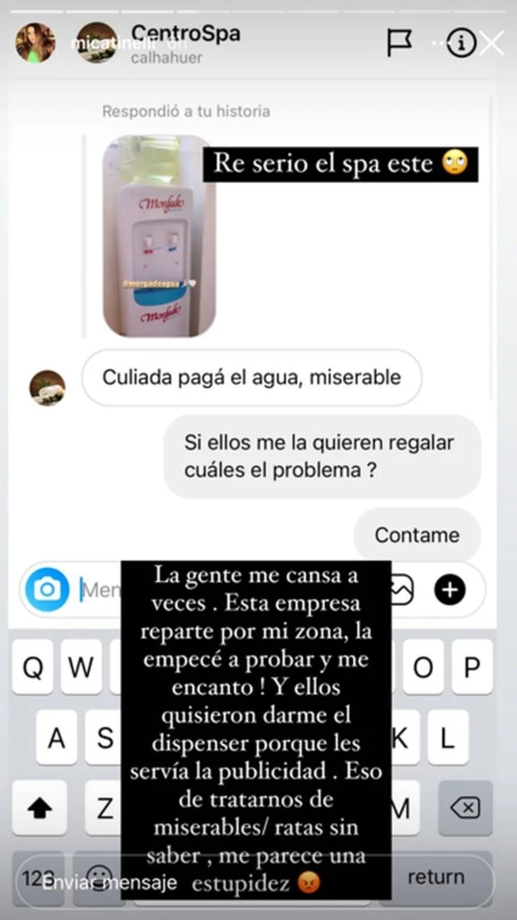 “La gente me cansa a veces. Esta empresa reparte por mi zona, la empecé a probar y me encantó. Y ellos quisieron darme el dispenser porque les servía la publicidad. Eso de tratarnos de miserables/ratas sin saber, me parece una estupidez”, agregó al mostrar la conversación en sus historias.