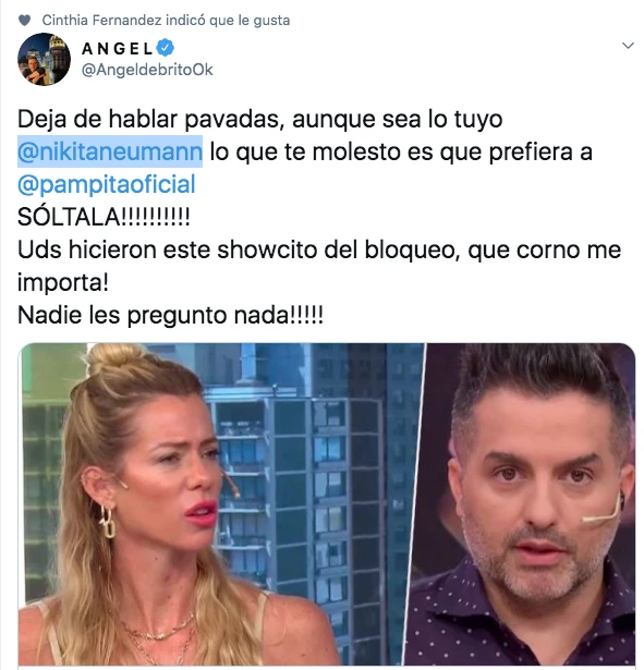 A los pocos minutos, la publicación de De Brito recibió el significativo "me gusta" de Cinthia Fernández, lo que podría establecer dos bandos bien definidos en la mañana de la emisora. Los "Nicolistas" por un lado contra los "Angelistas" del otro. Todo puede suceder en el resbaladizo y farragoso mundo de la tele.