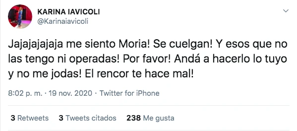 "Me siento Moria! Se cuelgan! Y eso que no las tengo ni operadas! Por favor! Andá a hacerlo lo tuyo y no me jodas! El rencor te hace mal!", le respondió Iavícoli.
