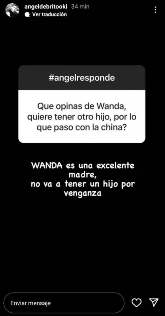 Y en las últimas horas le tocó hablar sobre el tema a Ángel de Brito cuando le preguntaron en su sección de Instagram “Ángel Responde”. "¿Qué opinás de Wanda? ¿Quiere tener otro hijo por lo que pasó con China?", alguien quiso saber.