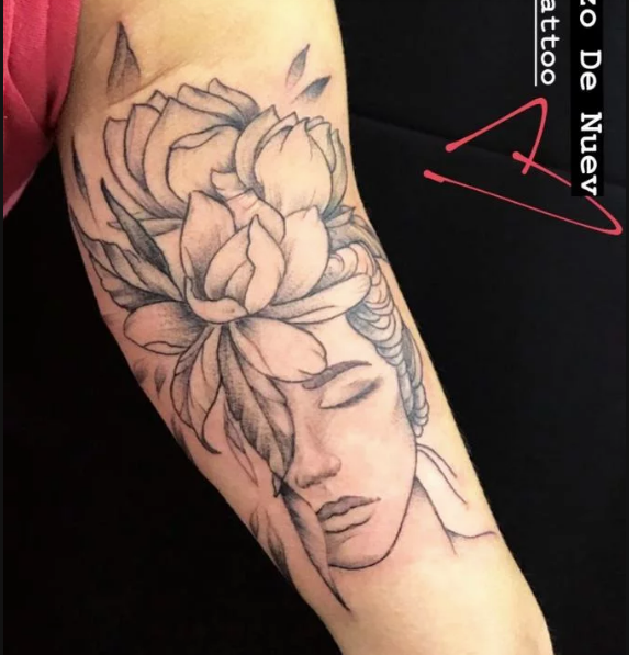 El tatuaje es un versión diferente de la artista mexicana, Frida Kahlo. El diseño muestra a la pintora con los ojos cerrados, el cabello recogido, y cargado de flores, elemento característico de ella. Los rasgos de la mujer se encuentran suavizados y con un trazo más menos marcado