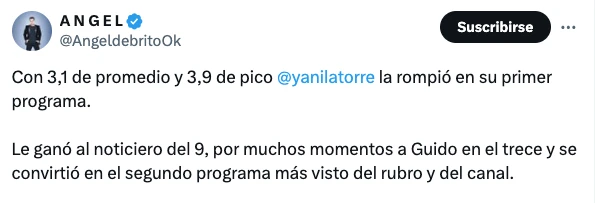 "Muy buen debut de SQP con pico de 3,6 y promedio de 3 puntos de rating en América TV" escribió en su cuenta de Twitter, esa en la que muchos se sienten llevados al firmamento televisivo y otros condenados al doloroso infierno de los números bajitos. Pero si a Yanina le faltaba una palabra era la de Angel de Brito, quien reposteó a la cuenta "Ptc Recargado Rating" que indicaba que a las 19:41 "SQP" estaba segundo en su franja con 3,5 sólo por detrás de los 6,3 que tenía Amor a cualquier Precio (Telefe) y por delante de Los 8 escalones de Guido Kaczka que en el 13 hacía 3,2 y de Telenueve Central que marcaba 2,6. Y si Angel lo dice... ¡El primer programa aprobó!
