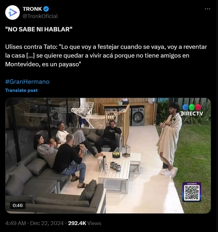 Durante una charla en el patio con Claudio, Chiara, Ezequiel, Juan Pablo y Carlos, los participantes que suelen escucharlo, Ulises habló sobre la tercera eliminación de Gran Hermano 2024, en la previa a las Fiestas de Fin de Año: "Lo que voy a festejar cuando se vaya... Voy a reventar la casa. Sino me voy yo. O se va el pibe este o agarro esta puerta...".