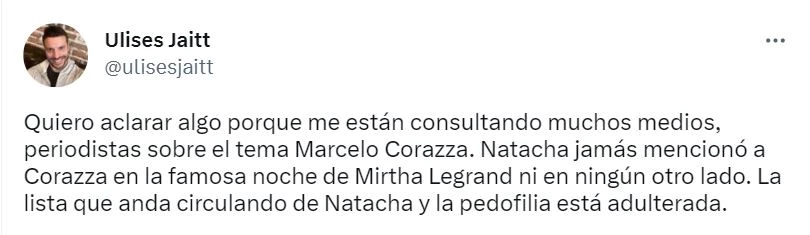 “Quiero aclarar algo porque me están consultando muchos medios, periodistas sobre el tema Marcelo Corazza. Natacha jamás mencionó a Corazza en la famosa noche de Mirtha Legrand ni en ningún otro lado”, arrancó Jaitt en su cuenta de Twitter. Y cerró: “La lista que anda circulando de Natacha y la pedofilia está adulterada”.