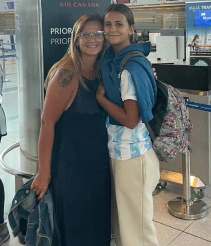 En las postales que se realizaron desde el aeropuerto, Uma eligió usar la camiseta de Argentina, una buena elección tratándose de un viaje cultural sabiendo el intercambio. Completó su outfit con un jogging cómodo, mientras su madre se encargaba de fotografiar cada momento con su celular.