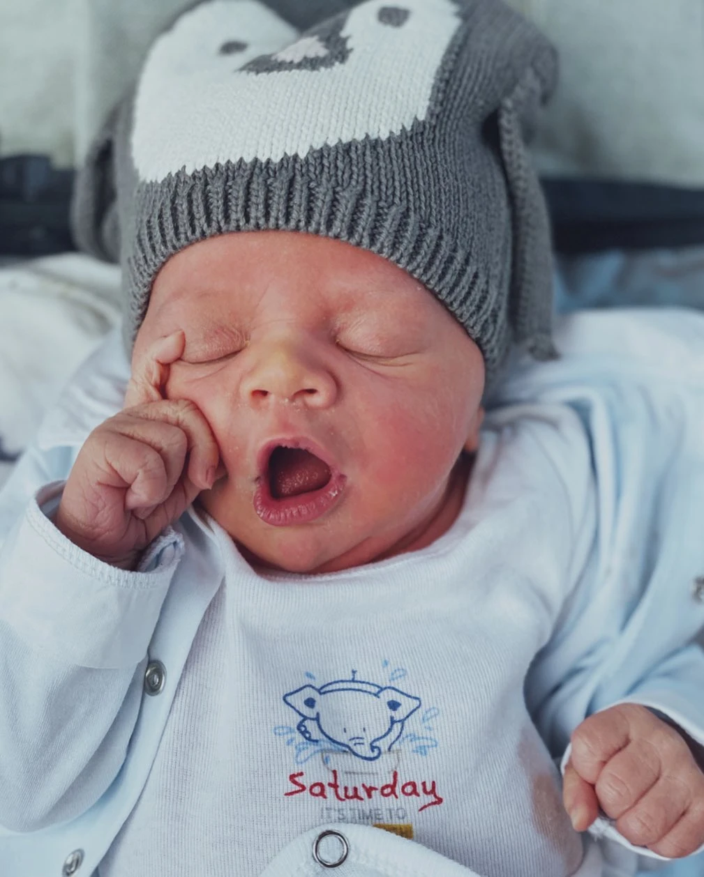 "Soy Viggo. Creo que ya pasaron 5 minutos y es hora de pedirle teta a mi mamá otra vez", escribió la modelo junto a la postal de su bebé con la carita en primer plano.