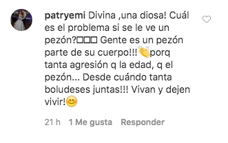 Las bromas sobre su descuido no fueron bien recibidas por algunas de sus fans quienes no demoraron en salirles al cruce. “Ayyy se asustan porque se le ve el pezón, será la primera vez que ven uno?... Chicos si no les gusta, no la sigan. Preciosa y llena de energía esa mamá!!”, respondió una de sus admiradoras.