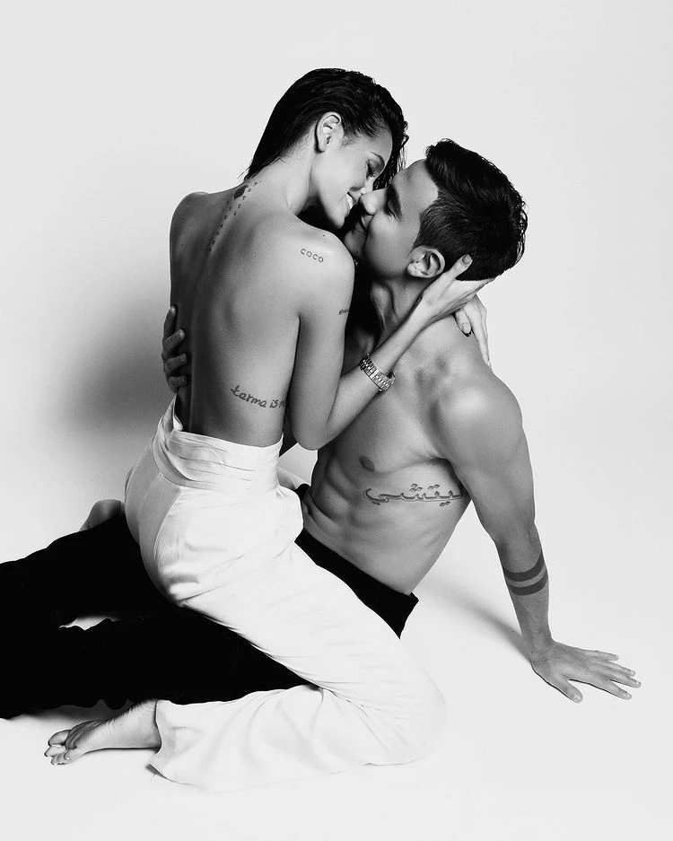 En las fotografías, una en color y otra en blanco y negro, se la puede ver a la modelo sentada sobre él luciendo un pantalón blanco, mientras que el delantero de Juventus luce un pantalón negro y muestra sus abdominales.