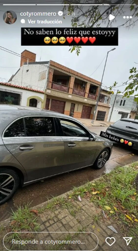 Una de las primeras historias de quien fue considerada por muchos en redes sociales como la mejor participante de la edición anterior de Gran Hermano, fue de ella apoyada en el capot de un Mercedes Benz y el texto que acompaña la foto fue "Otro Bebé", junto a un corazón y una carita emocionada.