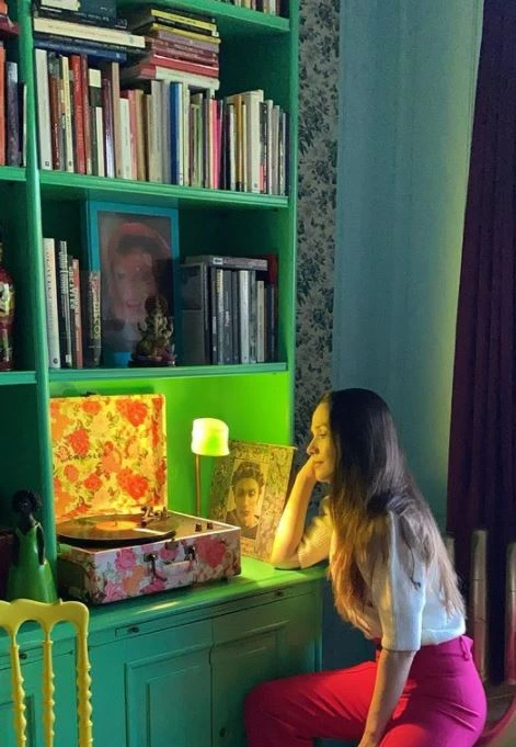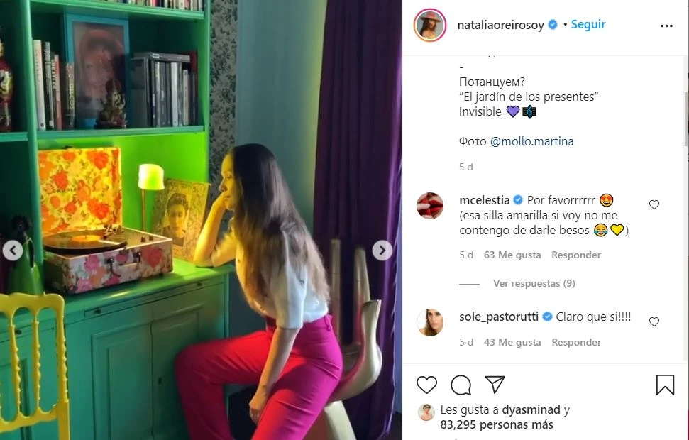 “¿Bailamos? El jardín de los presentes, Invisible”, escribió Natalia en su posteo de Instagram donde mostró parte de una habitación de su hogar: un cuarto donde domina un mueble con alzada pintado de color verde Tiffany en la que atesora su tocadiscos y varios libros de The Beatles y demás artistas.