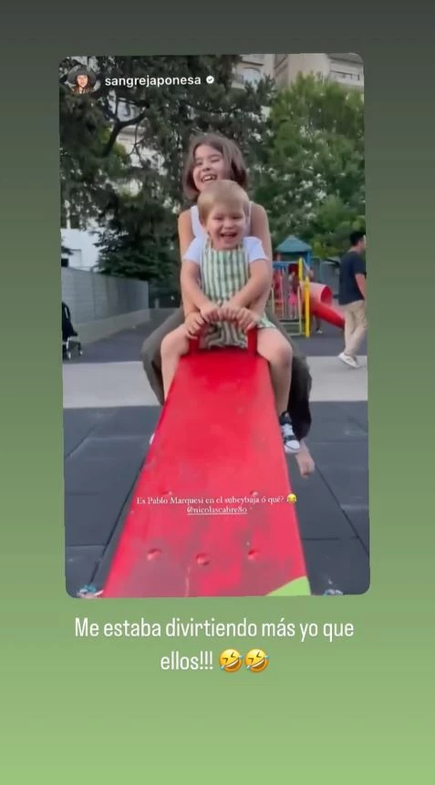 Así fue como Cabré replicó en sus historias un video donde se ve un divertido momento de juego en la plaza, visita que había hecho con la China, Rufina y Amancio, el hijo más pequeño que Eugenia Suárez tuvo con Benjamín Vicuña, de dos años y medio.