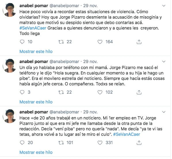 Anabel Pomar, publicó un tercer tweet y se mostró contenta por el despido de su ex compañero. “Hace poco volví a recordar estas situaciones de violencia. Cómo olvidarlas? Hoy que Jorge Pizarro desmiente la acusación de misoginia y maltrato que motivó su despido siento que debo contarlas acá. Se va a caer. Gracias a quienes denunciaron y a quienes les creyeron. Todo llega”
