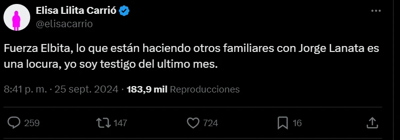 ¿Qué dijo Lilita? “Fuerza, Elbita, lo que están haciendo otros familiares con Jorge Lanata es una locura, yo soy testigo del último mes”, expresó la política en Twitter, dejando en claro que banca a muerte a la abogada que se casó con Lanata.